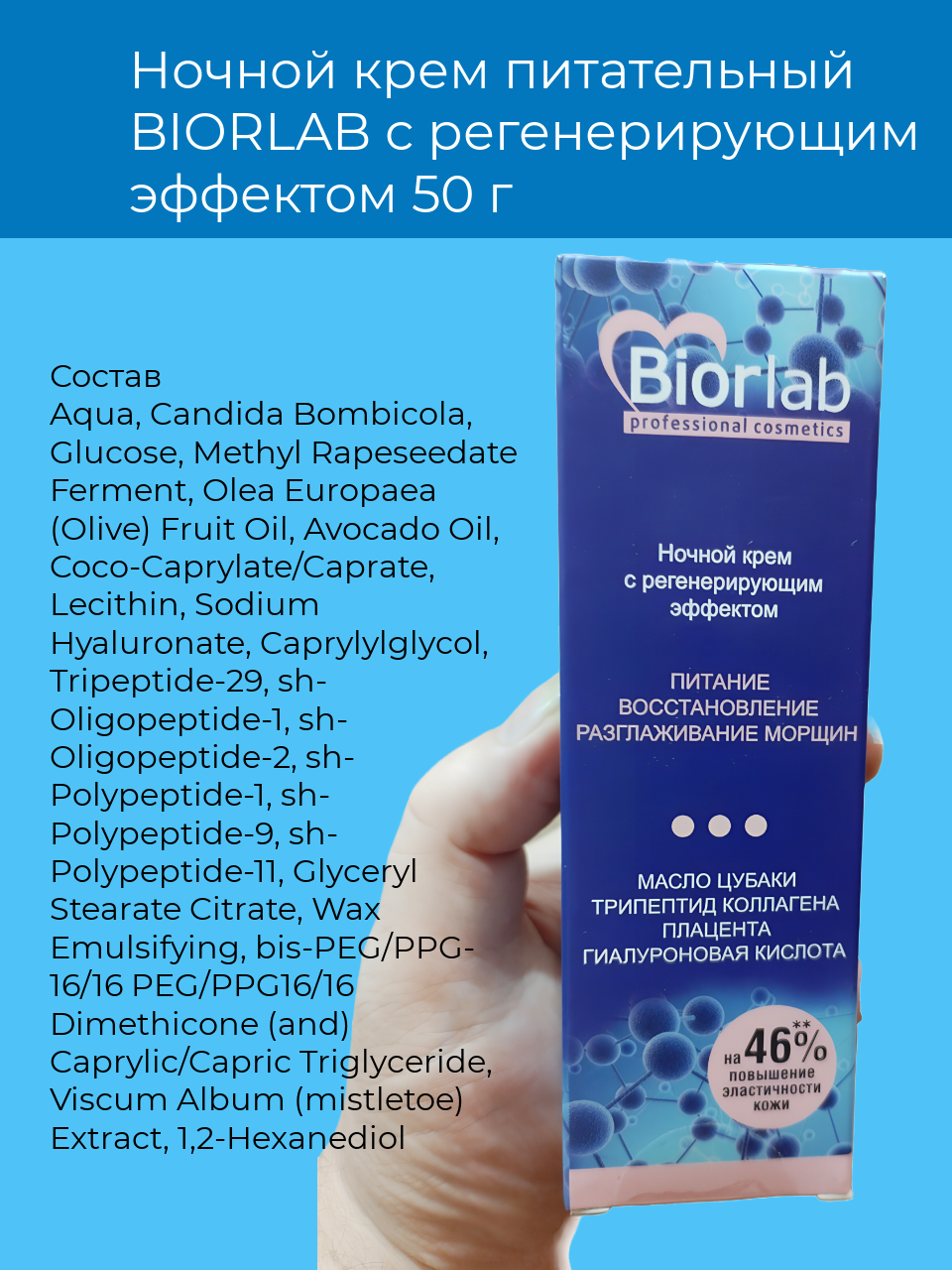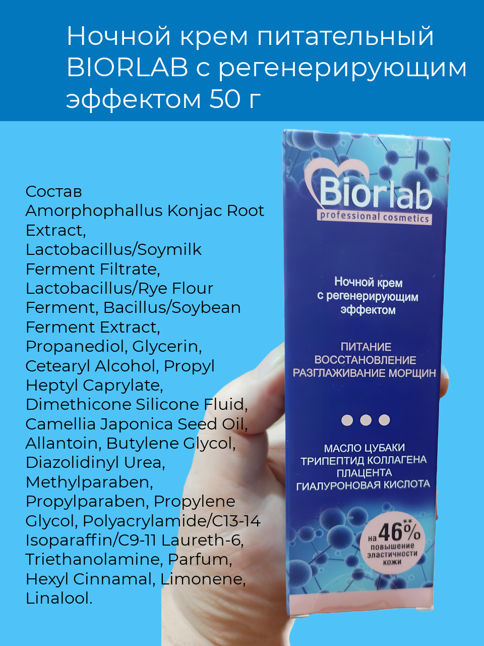 Ночной крем BIORLAB с регенерирующим эффектом не содержит вредных веществ и имеет базовый аромат свежести.